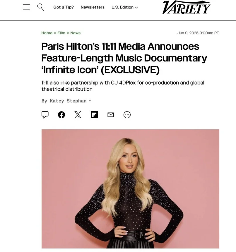 Entrepreneur and multi-hyphenate pop culture icon Paris Hilton, with her next-gen media company 11:11 Media, has announced “Infinite Icon,” a feature concert documentary set for worldwide theatrical release in early 2026. The film will tell the story of the making of her second album, “Infinite Icon,” and the role music has played in her life journey. - Variety